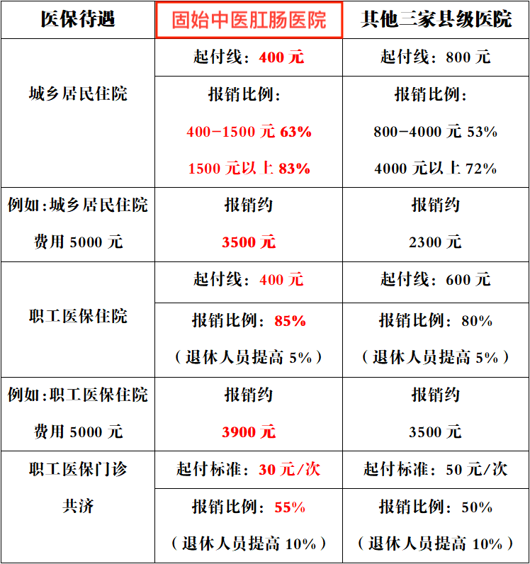 市级统筹后,固始中医肛肠医院同县域内其他三家县级医院医保待遇对比: